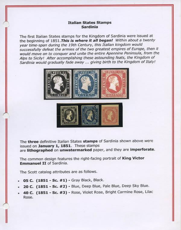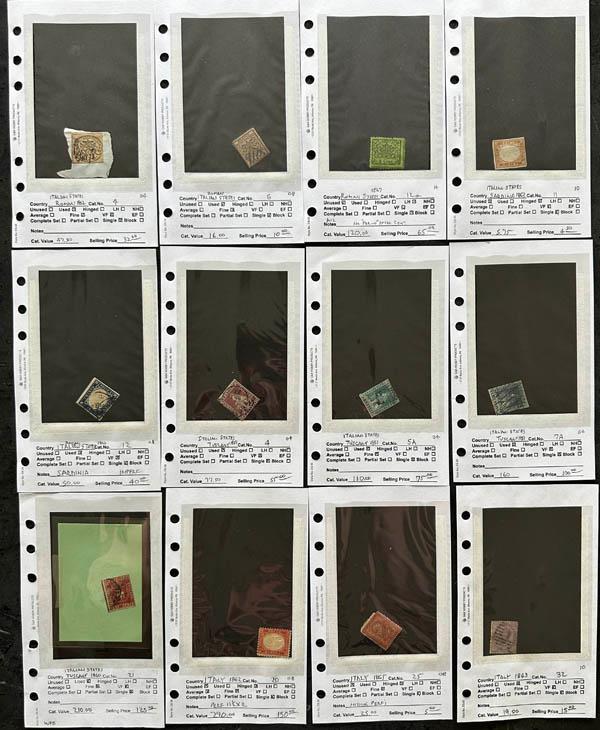 Italy: Papal States and Sardinia, 1852-1868, a small mint and used collection, neatly arranged on colorful annotated pages, with a fair range of issues included, including many rarities, also a few early letters and a small group of revenue stamps. Authenticity of some of the rarer items is not guaranteed, and there may well be some reference copies here, but this still a useful collection. Fully imaged - be sure to check the scans. Scott $12,000+. Estimate $300 - 400. View a PDF of images for this lot Scott $12,000+ Suggested Bid $300-400 (Image)