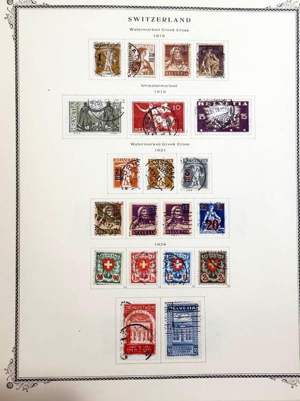 Switzerland, 1901-1980, an extensive and very attractive used collection, hinged on Scott album pages, very nearly complete in the regular issues from 1901-1975, also fair semi-postals, airmails very near complete and spotty postage dues and officials. Noteworthy items include the 1945 PAX set ($807). In generally excellent condition with neat cancels and no faults noted, Fine to Very Fine or better, a lovely lot for the serious Swiss collector. A sampling has been imaged. Shipping weight 2 lbs / 0.9 kilos. Scott approximately $3,300. Estimate $300 - 400. View a PDF of images for this lot Scott approximately $3,300 Suggested Bid $300-400 (Image)