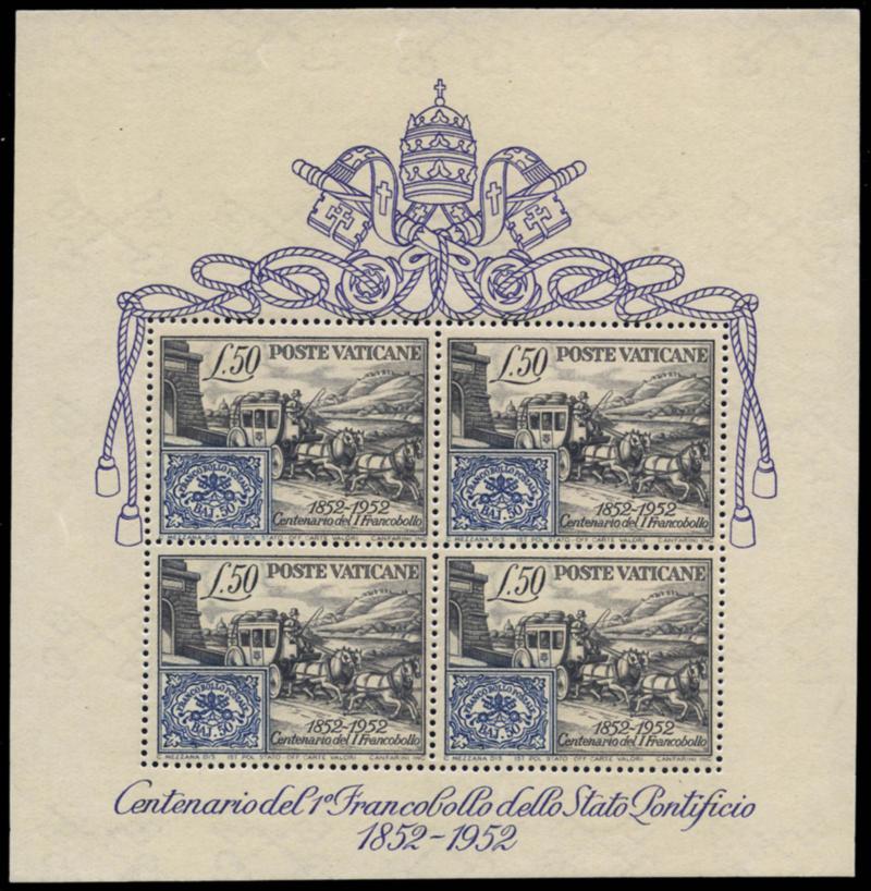 Vatican, 1952, Stamp Centenary souvenir sheet (Scott 155a. Sassone Foglietto 1), o.g., never hinged, Very Fine. Scott $160. Sassone €325 ($350). Estimate $50 - 75. Scott $160 Suggested Bid $50-75 (Image)