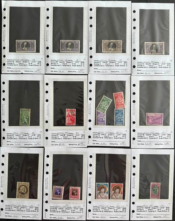 Vatican, 1931-2006, a dealer's stock of mint and used, containing sets, singles, souvenir sheets in regular issues, airmails and postage dues; all housed on stock pages in three binders plus some modern (1958-68) FDC's and postcards; most stamps imaged on the website, Fine to Very Fine. 2014 Scott approximately $1,553 ++ (Owner's). Estimate $80 - 120. 2014 Scott approximately $1,553 ++ (Owner's) Suggested Bid $80-120 (Image)