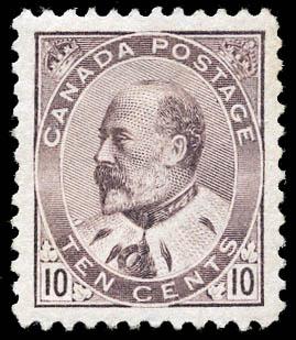 Canada, 1903, King Edward VII, 10¢ brown lilac (Scott 93), a gorgeous stamp, almost perfectly centered, expertly regummed, Extremely Fine to Superb. Scott $400 for o.g. Estimate $30 - 40. Scott $400 for o.g. Suggested Bid $30-40 (Image)