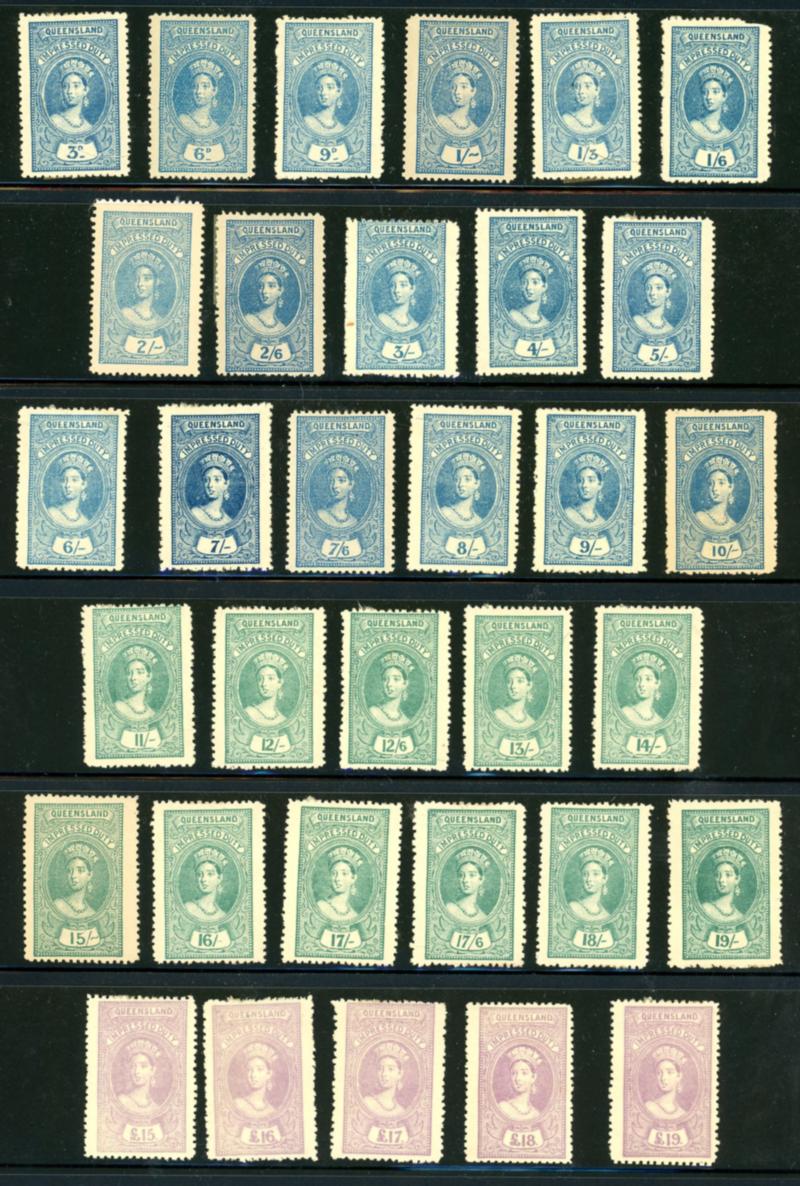 Queensland Impressed Duty Stamps - Barefoot catalog 1-28, 47-63 embossed remainders with o.g. and hinge remnants. Some have minor defects or cuts from the embossed cancel. 1996 Barefoot CV is $265. Mixed condition. (Est $120-150) (Image)