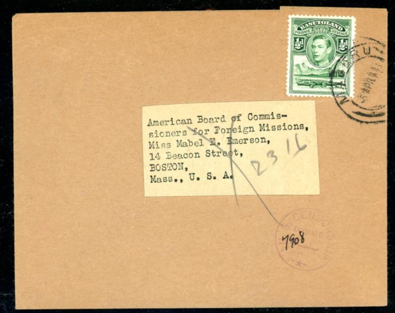 Basutoland Scarce 1943 Wrapper Sent to Boston - Scott 18 on wrapper to Boston with "US Censorship Examiner 7908" receiving cancel. Sent from Maseru April 5, 1943. F-VF. (Est $75-100) (Image)