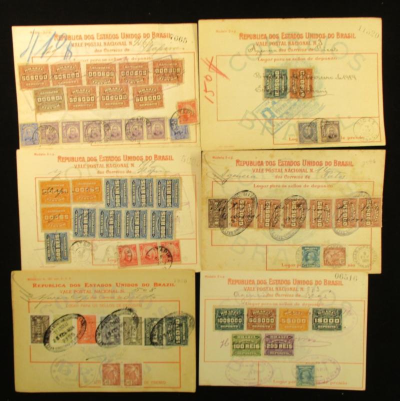 Brazil - Around 200 Bank Receipts with Revenues - Interesting lot of 200 or so bank receipt cards from 1915-1927 each having revenues tied to card. Most receipts hold multiples or several different denominations. Generally fine or better. (Est $100-150) (Image)