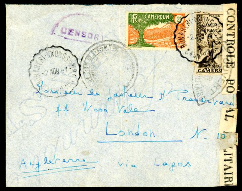 French Cameroun Scott 207, 277 on 1941 Cover to London Via Lagos - Great cover, double censor, from Bonaberi Cameroun to London via Lagos (Nigeria). "Control Postal Comission" cancel on front and Lagos transit cancel on reverse. Vertical file fold not affecting stamps, opened at top. Fine. (Est $75-100) (Image)
