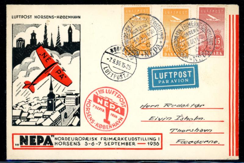 Denmark 1936 Airmail First Flight Event Cover - Scott C6 (x2) and C7 tied by "HORSENS" first flight commemorative cancels and Copenhagen 1936 receiving cancel. Scarce bi-colored event cover. VF. (Est $75-100) (Image)