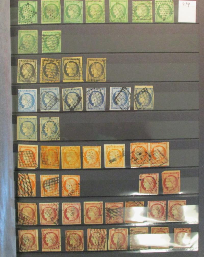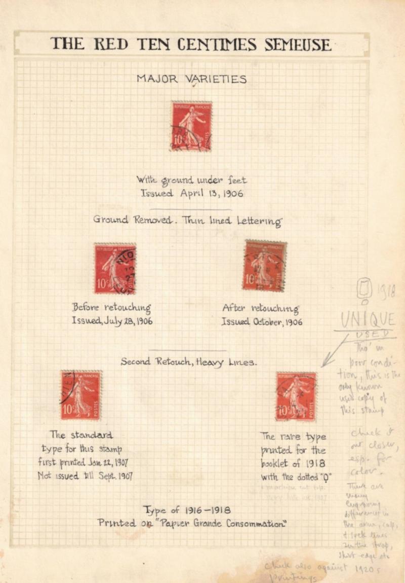 France Sower Issue Varieties with Strasbourg Souvenir Sheet - Esoteric group with one page holding the 10¢ red Sower issue with major varieties documented; groups of surcharges, precancels, and French colony overprints on two stockcards; splayed open booklets of 20 stamps with 30¢ and 50¢ issues; and a 1927 Strasbourg souvenir sheet (horiz fold along bottom perfs and stuck down to page upper right). Examine. (Est $250-300) (Image)