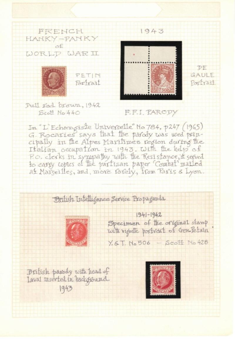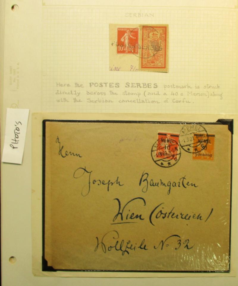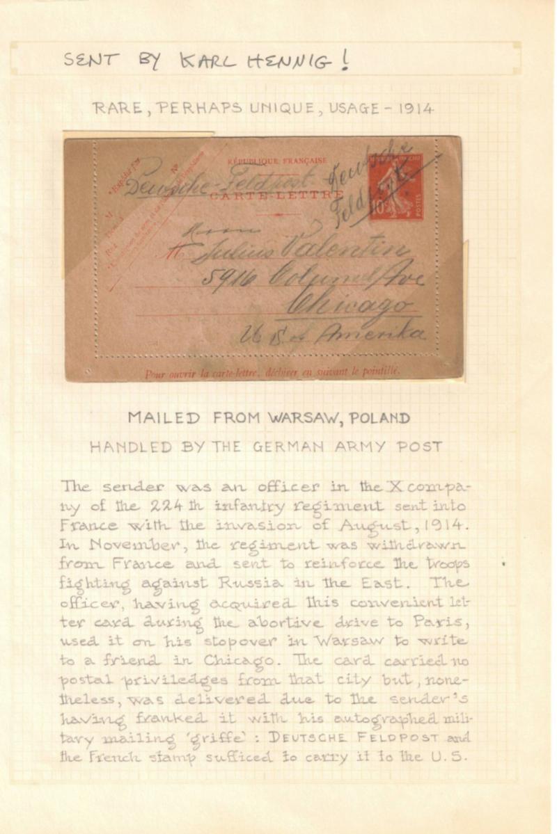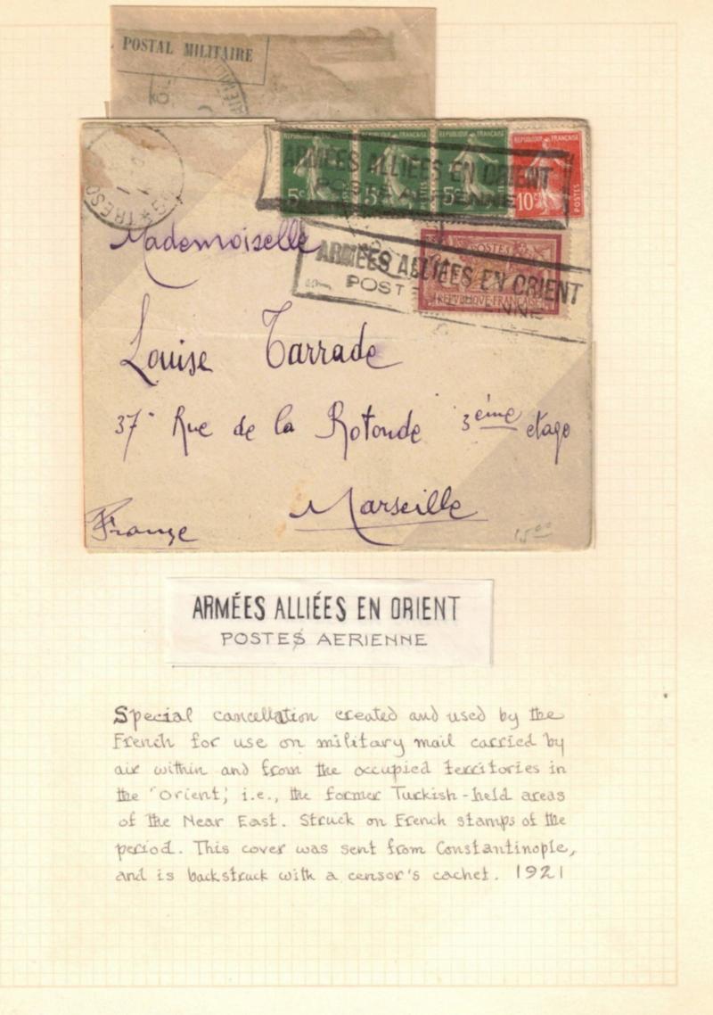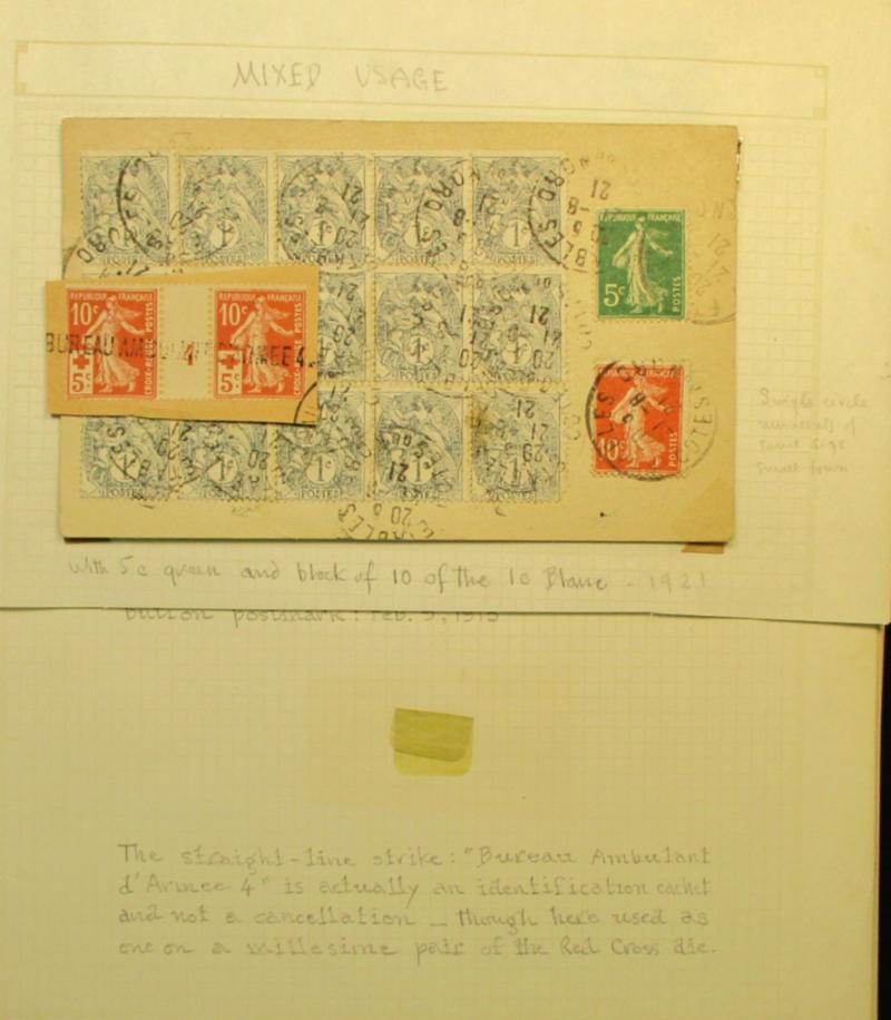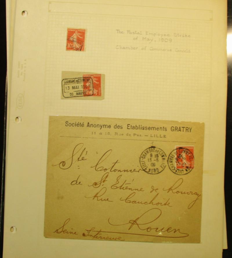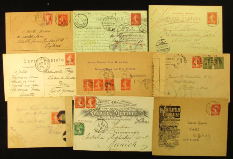 France Postal History Group with 10¢ Sower Issue - 50+ covers/cards (with some stamps on tied to pieces). Many interesting cancels with better including WWI military censor, ship cancels, foreign offices abroad, early aviation picture postcards with good content (and map!), Syria overprints, more. Some mounted and annotated by owner, some still loose. Mixed condition. (Est $100-150) (Image)