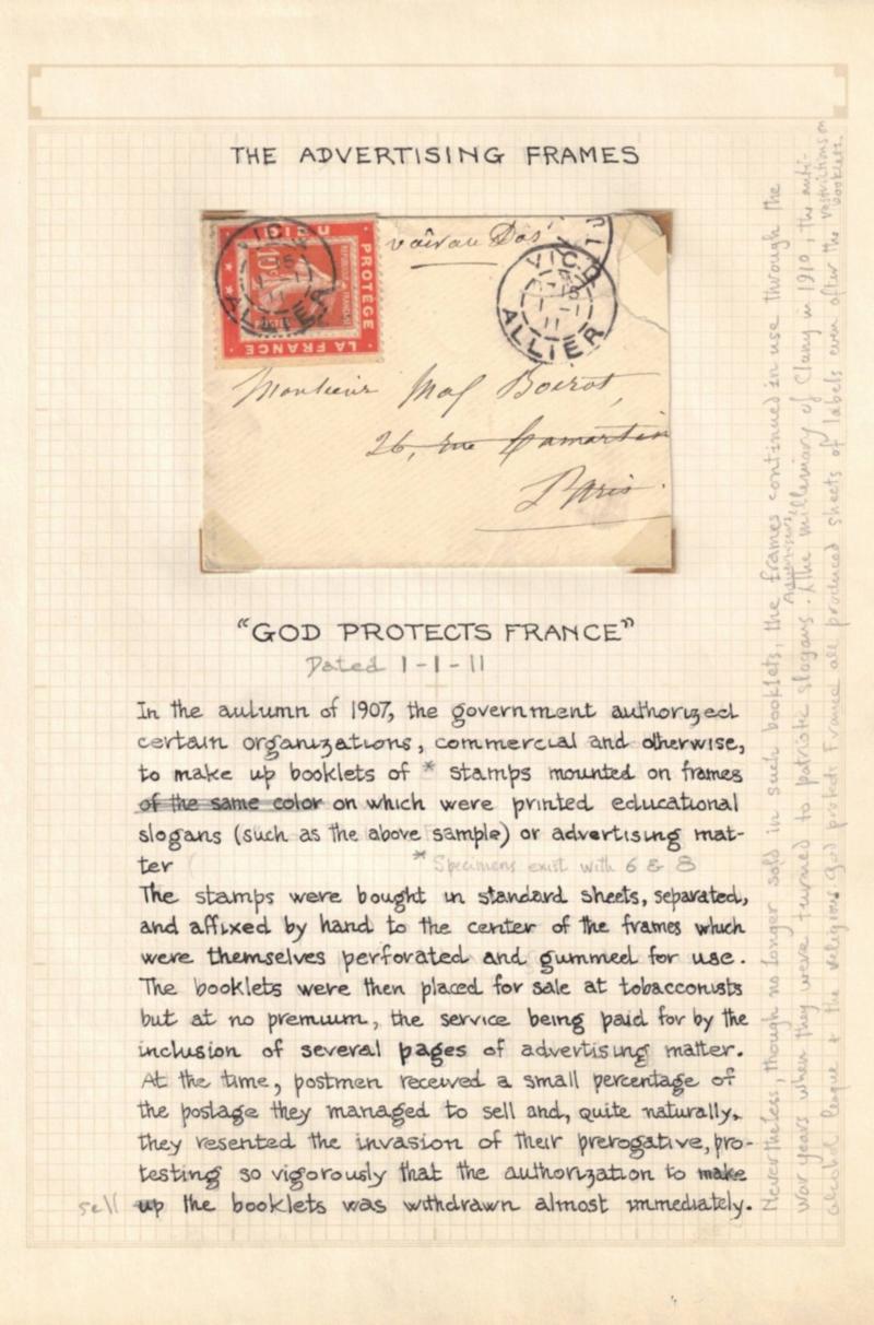 France Sower Issue with Advertising Frames - One cover (scarce) and 19 used tied to frame, and then 7 unused in frame and one French Morocco unused in frame. Most hinged with owner's notes to quadrille pages. Difficult to duplicate a lot like this. Generally fine or better. (Est $100-150) (Image)