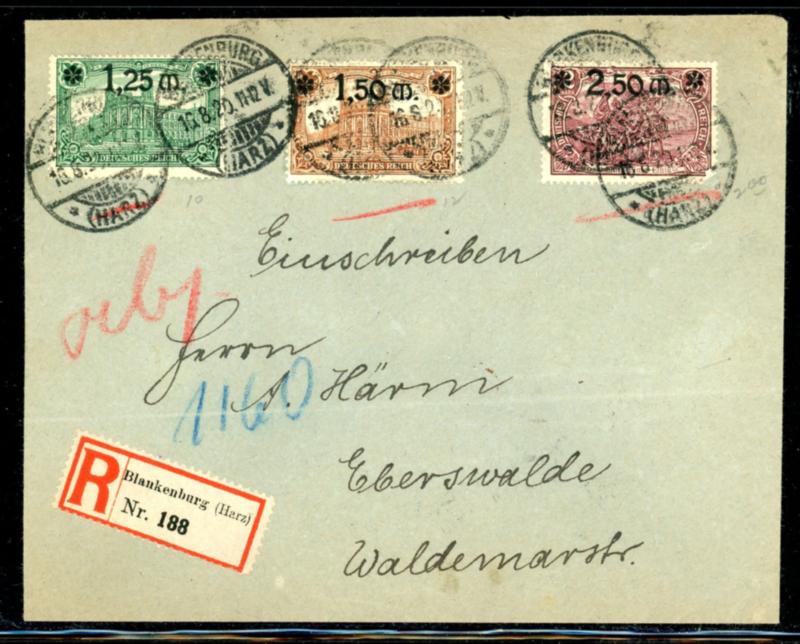 Germany Scott 115-117 on 1920 Registered Cover - Registered cover from Blankenburg sent to Eberswalde with better frankings. Receiving cancel on reverse. Horizontal crease not affecting stamps. Otherwise F-VF. (Est $75-100) (Image)