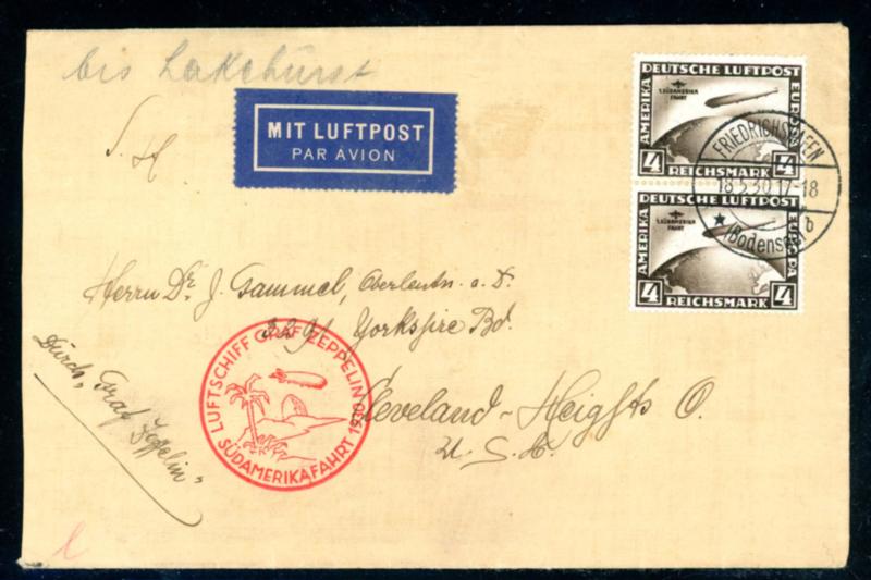 Germany Scott C39 Pair on 1930 South American Zeppelin Cover - sent to Cleveland Hts., OH in 1930. Proper markings front and back with airpost label. Cover is slightly reduced at left. F-VF. (SCV $375 for a single on cover) (Image)