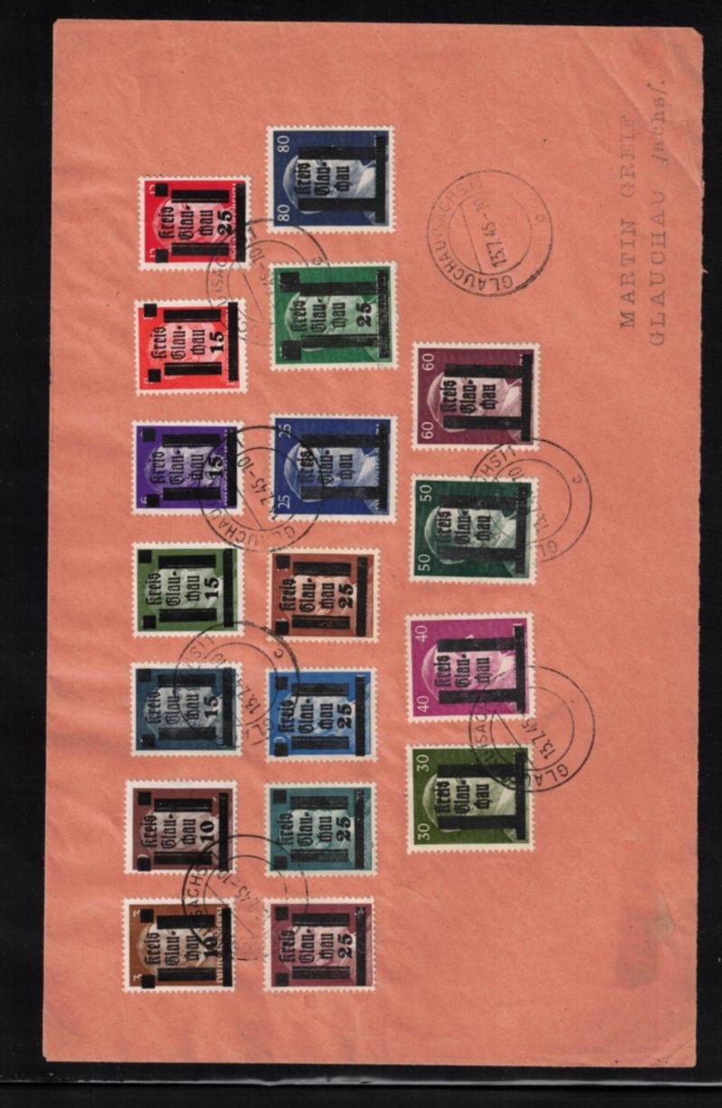 Germany - Glauchau Locals Cover, 1945 - Glauchau local issues 1-18 tied to cover by July 13, 1945 Glauchau (Saxony) favor cancels. Cover neatly opened at bottom and has some corner creases away from stamps. Michel €480. F-VF. (Est $100-150) (Image)