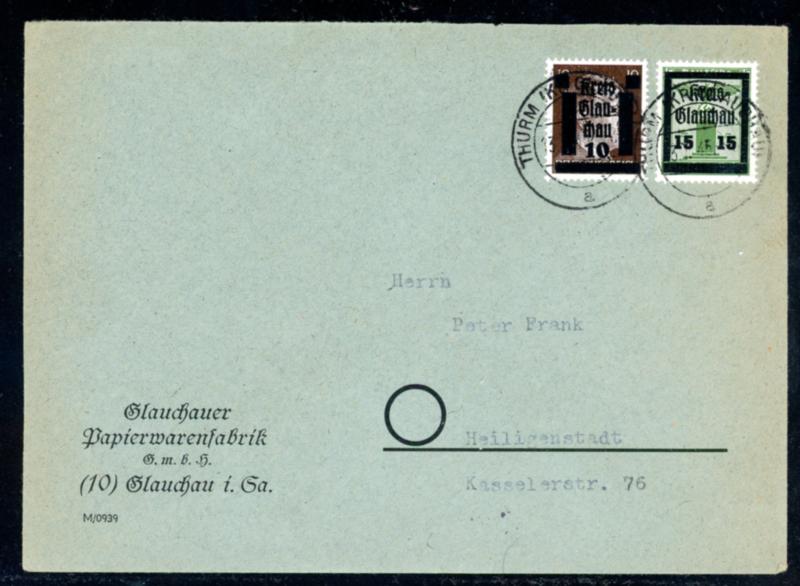 Germany - Glauchau Locals Cover, 1945 - Glauchau local issues Michel #2 and #23 tied to cover by Thurm 1945 cancels, paying the 25pfg internal rate. Cancel sent to Heiligenstadt Germany. Michel #23 on cover has a value of €1000. Neatly opened at top. Appears genuine but sold "AS IS". F-VF. (Est $100-150) (Image)