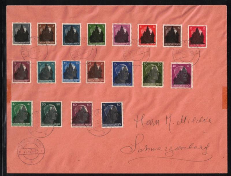 Germany - Schwarzenberg Cover, Michel #1.I-19.I, 1945 - Allied occupation (Soviet Zone- State of Saxony) Schwarzenberg with Michel 1.I-19.I (19 different) tied to large cover by Schwarzenberg July 22, 1945 cancels. Favored cancel last day of usage. Tape remnants at sides. Otherwise F-VF. See scans. Michel €290 for tied to piece. (Est $60-80) (Image)
