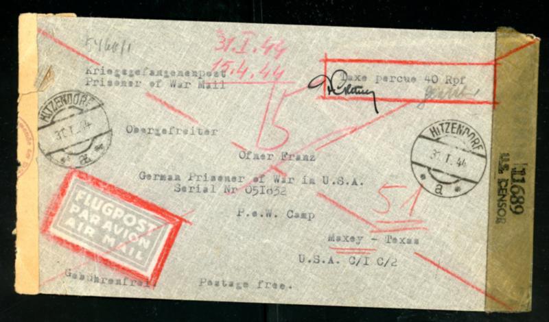 Germany POW Cover Sent to Texas Camp, 1944 - Busy cover mailed from Hitzendorf Germany on Jan 31 1944 to POW camp Prisoner in Maxey, TX. German and US censor tape and boxed "TAXE PERCUE 40 Rpf" fee with officials signature. Sent by airmail and "Postage free" notation. Several cover creases at left. Fine. (Est $90-120) (Image)