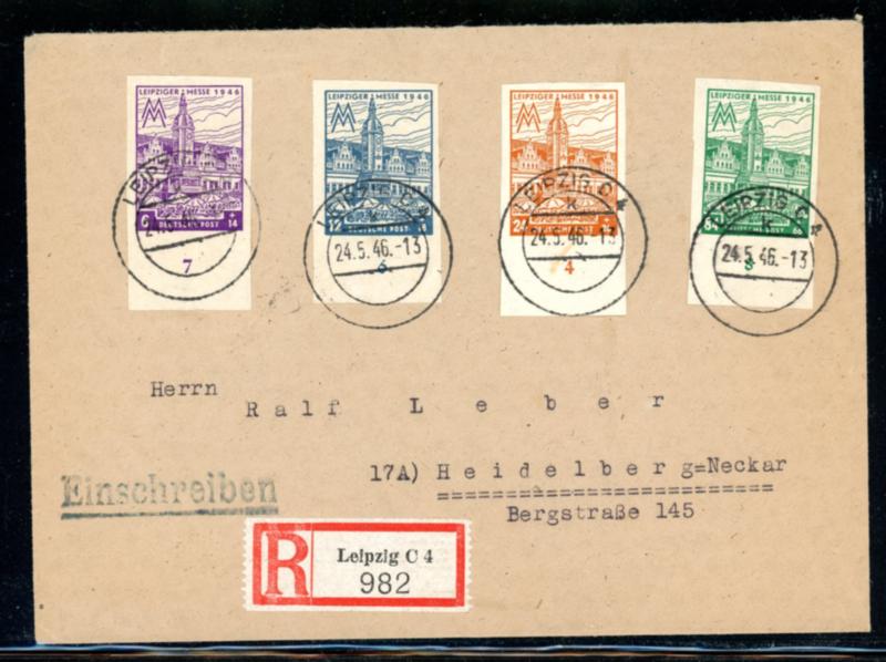 Germany Soviet Zone West Saxony Cover, 1946 - Michel 162.B.Y-165.B.Y.b (4 different) tied to registered cover by May 24, 1946 Leipzig cancel. Heidelberg receiving cancel on reverse. Opened at top. Michel €375 (Est $100-150) (Image)