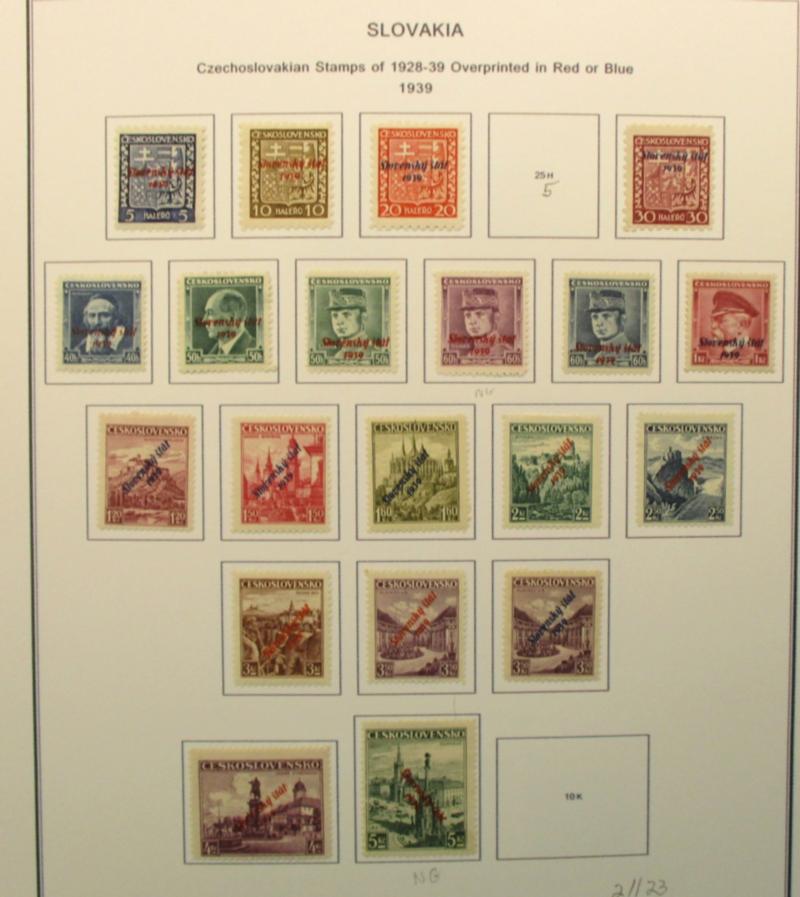 Slovakia and Slovenia Collections - A two binder collection of "old and new" Slovakia featuring around 550 stamps and souvenir sheets mounted or hinged to Steiner computer generated pages (not complete). Slovenia is on Minkus pages and features 110 stamps with better German occupation unused sets like Scott N36-54, N55-70, NC11-7, and NJ14-22. Overall SCV $1100 with 2/3 of the value in Slovakia. Generally fine or better. (Est $250-300) (Image)