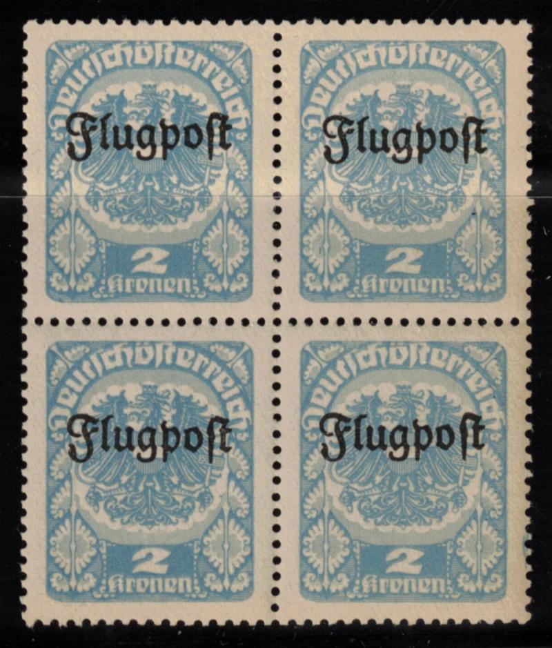 Austria 1920 Airmail, Sanabria 8 MNH Block/4 "Flugpost" - "Flugpost" overprinted on 1920 postage stamp. Prepared but not issued. Only 250 exist. Each stamp signed. (Est $400-500) (Image)