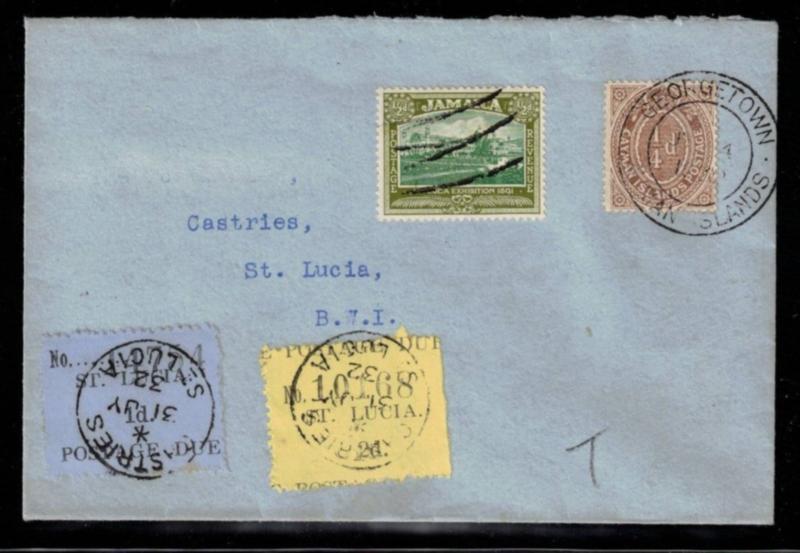Cayman Islands Scott 31 on 1932 Cover, Postage Due - Scott 31 tied by Georgetown July 4, 1932 cancel to St Lucia. Penciled "T" postage due marking paid with St Lucia Scott J1 and J2 also tied by Castries July 31, 1932 cancels with same receiving cancel on reverse. Unusual addition of Jamaica Scott 75 (or 88) not tied by double 2-line cancel. Rare cover, possibly unique. (Est $300-400) (Image)