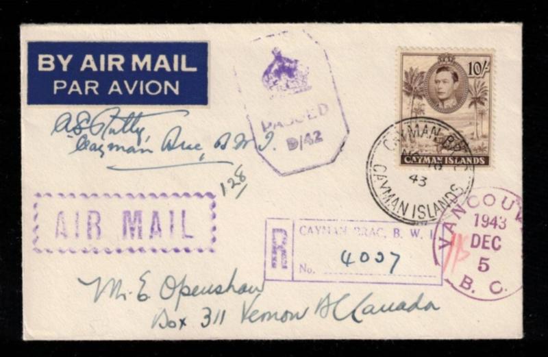 Cayman Islands Scott 111 on Registered Cover to Canada - Scott 111 (10/- high value KGVI) tied to registered airmail cover to Vernon, BC, Canada. Tombstone WWII censor marking. Sent from Cayman Brac Island via Kingston Jamaica, Miami, Vancouver, and Vernon receiving cancel. Scarce single usage on clean cover. (Est $75-100) (Image)