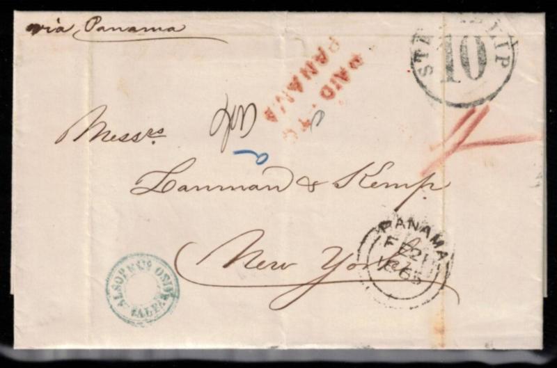 Valparaiso Chile Stampless Cover to New York, 1865 - Sent to Lanman and Kemp Co., New York, Feb 2, 1865 via Panama. Red "PAID to/PANAMA", British Panama FE 21, 1865. Transit and "STEAMSHIP 10" markings. Few file folds, otherwise F-VF. (Est $50-80) (Image)