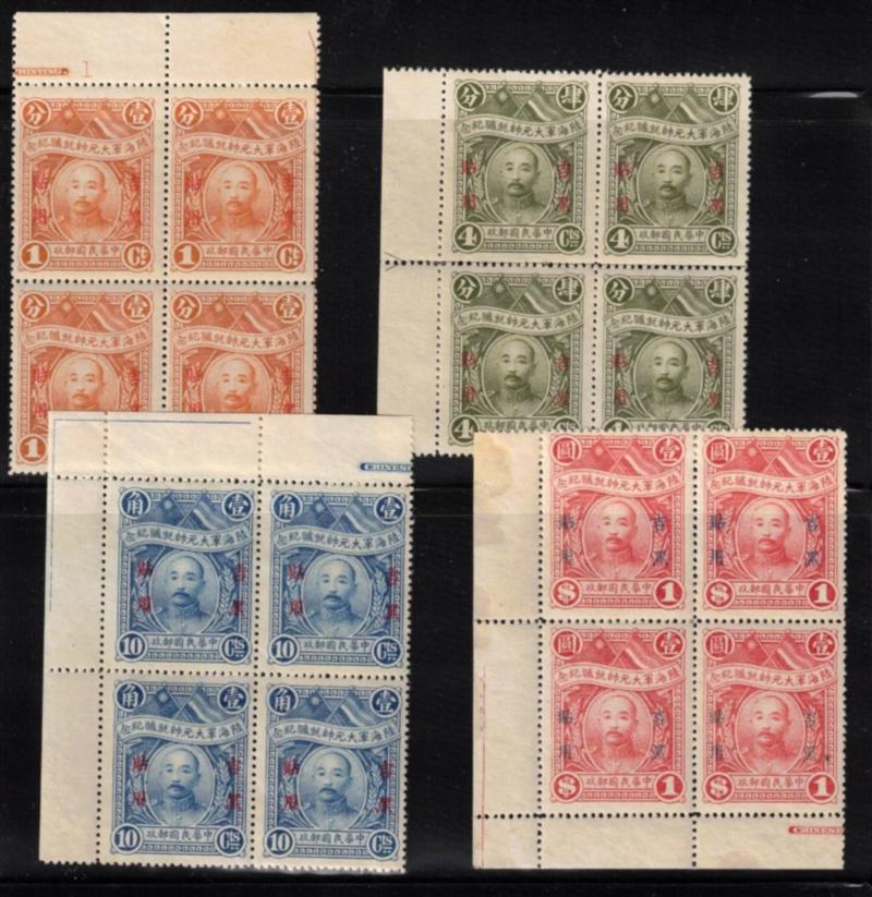 China Manchuria Scott 21-24 MH Complete Set Blocks/4 - 1928 Chang Tso-lin issue overprinted. Complete set of 4 in margin blocks of 4. Gum toning and gum residue on face in selvage only (high value). F-VF. (SCV $238) (Image)