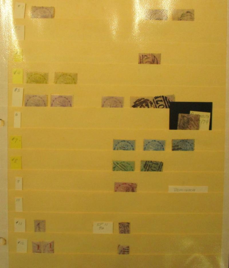 Dominica Accumulation - Many Better! - Several 100 unused/used on stock pages from beginning to 1970s. Note several SPECIMEN overprints, some multiples, and a couple better sets on old album pages. Many in the $20+ range. Later include some MNH sets and souvenir sheets. Some duplication and please note there is some musty odor and few are stuck due to storage. Please examine! (Est $200-250) (Image)