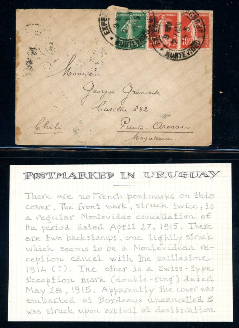 France Scott 159, 162 Used on Cover Postmarked in Uruguay - Interesting 1915 cover with France Sower issues likely never postmarked in France but rather upon its arrival in Uruguay on its way to Chili. Both Montevideo and Punta Arenas (Chili) receiving cancels. Letter enclosed. Cover with some stains at left and roughly opened at top. Unique. (Est $50-100) (Image)