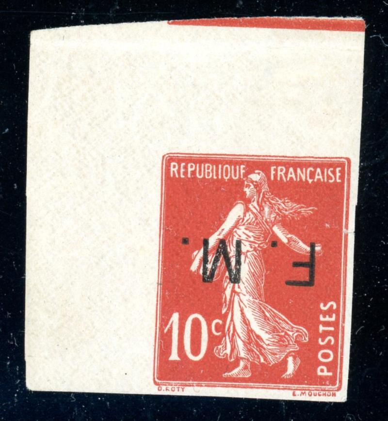 France Scott M5a MH Margin Single, "F.M." Overprint Imperf and Inverted - Margin mint single with tiny tear into design at right, and hinge remnant in selvage. Scarce! (Est $90-120) (Image)