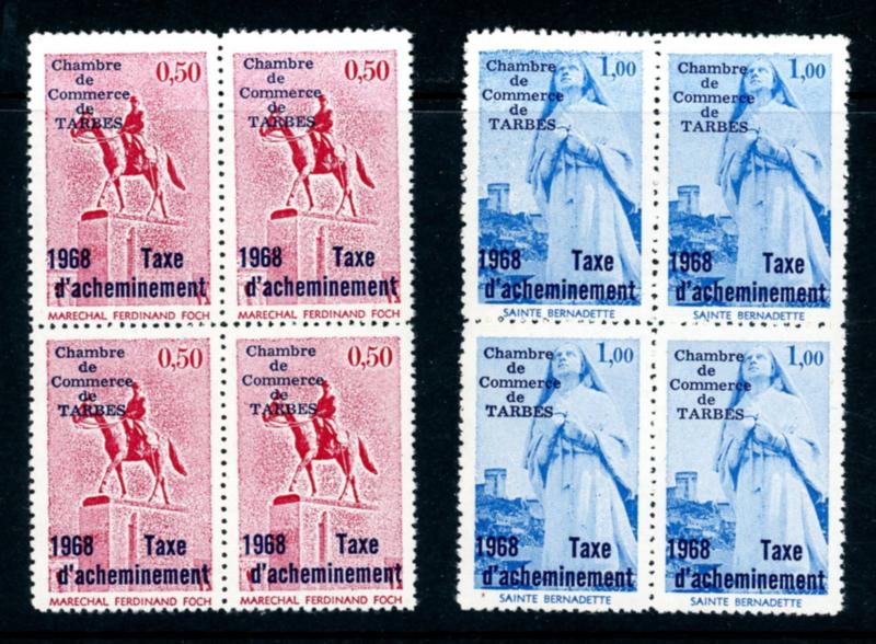 France Ceres 5-6 Chamber of Commerce 1968 in MNH Blocks of 4 - Two different MNH blocks featuring Marshall Ferdinand Foch and St Bernadette. Chamber of Commerce 1968 postal strike stamps. F-VF MNH. (Est $200-300) (Image)