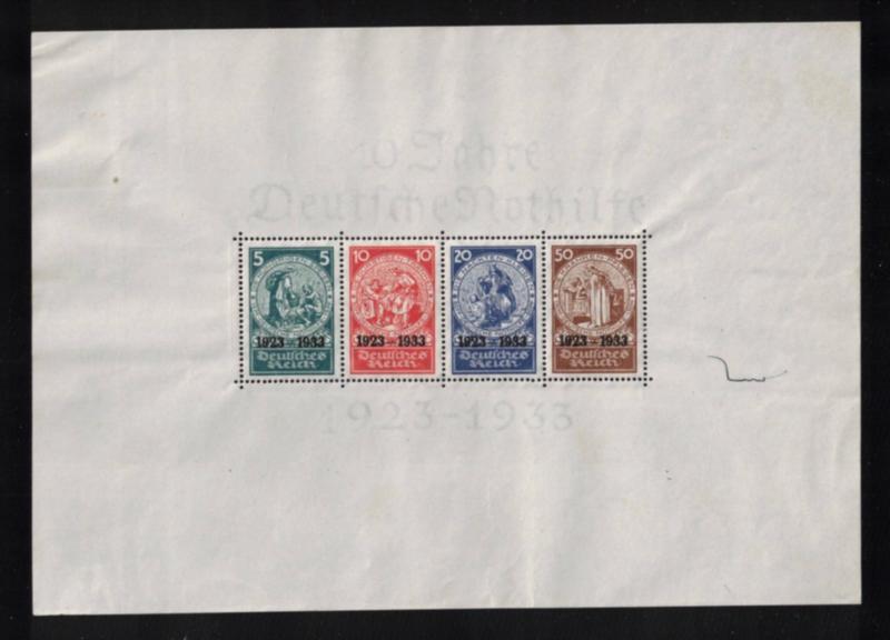 Germany Scott B58 MVLH Faults, 1933 Ten Year Souvenir Sheet - Sheet has ink mark in selvage of sheet, inclusion, bends, etc. Stamps appear MNH as well as the sheet. Sold "AS IS". (SCV $1150 as hinged) (Image)
