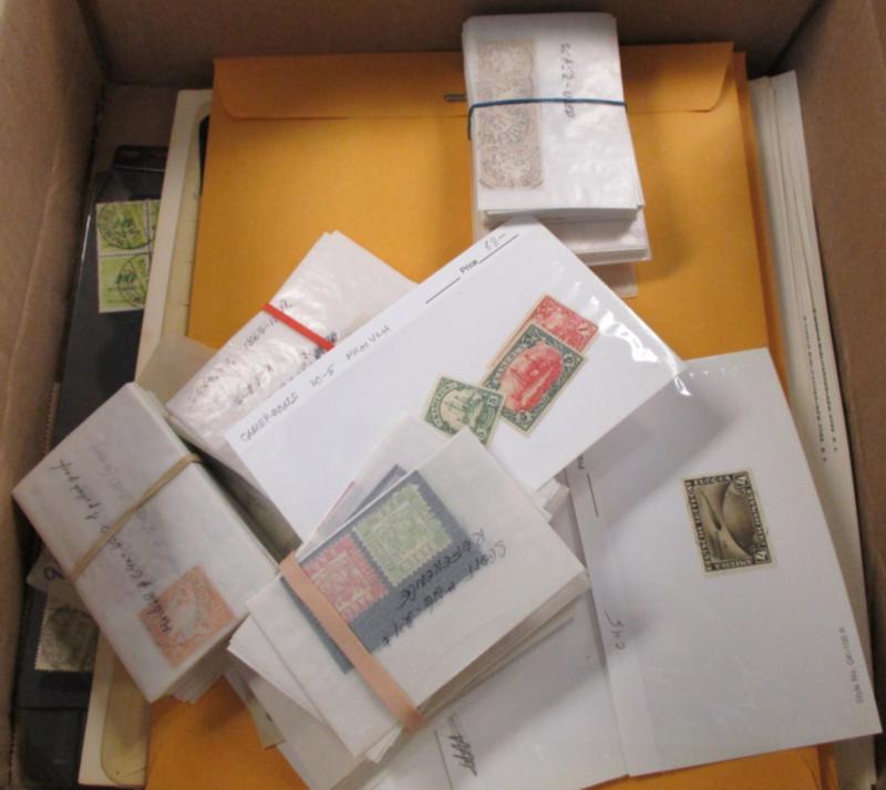 Germany and Areas Boxlot - Medium box holding Germany, States, and colonies. There is a group of souvenir sheets including an Ostropa (on backing paper), Hitler sheets, Olympics, etc.; a cancel collection of German colonies, occupation, and offices; a couple 100 small glassines holding German States in very mixed condition all id'ed by Scott/Michel; a decent collection of Gen'l Govt, Plebiscites, Wurttemberg on Minkus pages, and some good value in a few of the dealer cards like a Germany Scott C45 used Zeppelin. Take your time with this and uncover the value. Expect mixed condition. (Est $400-600) (Image)