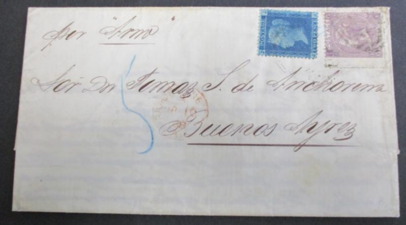 Great Britain Scott 29, 45a on 1868 Folded Letter to Buenos Aires - Stamps tied to folded letter sent from Rio de Janeiro to Buenos Aires via steamer "Arno", a BWI sailing ship. Letter in fine+ condition. (Est $80-100) (Image)
