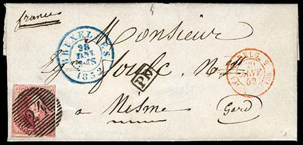Belgium, 1851, 40c carmine rose. Huge margin at bottom with adjacent stamp, slightly cut in at left, tied on 1852 folded letter from Brussels to Nimes (France) with crisp barred numeral "24", blue "Bruxelles 28-Jan, 1852" cds and red transit datestamp on front, backstamped "Nimes 31 Jan, 52", Very Fine. Michel No. 5By. Scott No. 8; Estimate $150 - 200. US$150-200 (Image)