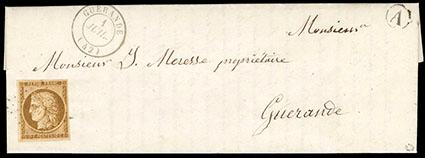 France, 1850, Ceres, 10c bister on yellowish. Four margins with bright color, tied on 1854 locally mailed folded letter with "1464" in dotted diamond cancel, matching "Guerande 1 Jul 54", cds above, Extremely Fine and choice, with 2011 Roumet certificate. Yvert No. 1. Scott No. 1; Estimate $200 - 300. US$200-300 (Image)