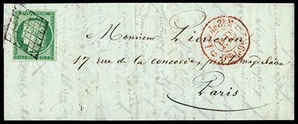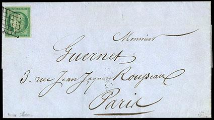 France, 1850, Ceres, 15c green on greenish. Four margins, good color, tied on 1850 folded letter locally used in Paris, with diamond grid, red "G Lev G P.P" circular handstamp (Pothion #2780) in red at right, backstamped " Paris 23 Sept, 50" receiving cds, Extremely Fine, with 2017 Roumet certificate. Yvert No. 2. Scott No. 2; Estimate $750 - 1,000.