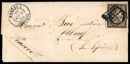 France, 1849, Ceres, 20c black on yellowish. Margins clear to mostly large around, tied on 1850 folded letter from Mascara, Algeria to Elbeuf, France by diamond grid cancel, with "Mascara, Algerie, 30 March, 1850" cds at left, receiving backstamp, a Very Fine cover, a scarce early Algeria usage . Yvert No. 3. Scott No. 3; Estimate $200 - 300. US$200-300 (Image)