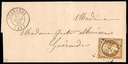 France, 1852, Presidency, 10c pale bister on yellowish. Four large margins, fresh color, tied on locally used 1853 folded letter with numeral "1464" in diamond of dots, matching "Guerande 7 Apr, 53" cds at left, Extremely Fine, a very clean cover, with 2011 Roumet certificate. Yvert No. 9. Scott No. 10; Estimate $300 - 400. US$300-400 (Image)