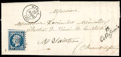 France, 1852, Presidency, 25c blue on bluish. Large margins showing portion of adjacent stamp at top, tied on folded letter from Mansle to Saintes by "672" in dotted lozenge handstamp, with matching "Mansle, 29 Mars, 53" cds alongside, cursive "15 Cellefroin" cancel at right, receiving backstamp, Extremely Fine, an exceptional cover. Yvert No. 10. Scott No. 11; Estimate $100 - 150. US$100-150 (Image)