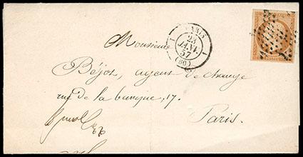 France, 1853, Napoleon III imperforate, 10c bister on yellowish, type I. Tied to 1857 folded letter with dotted 6-pointed star cancel, "Paris, 23 Jan, 57" cds alongside, local usage, Extremely Fine. Yvert No. 13A. Scott No. 14; Estimate $50 - 75. US$50-75 (Image)