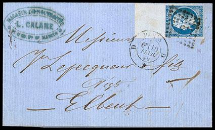France, 1854, Napoleon III imperforate, 20c blue on bluish, type I. Large margins with huge top margin, tied on folded letter from Paris to Elbeuf with diamond of dots cancel and "Paris 10 Feb, 59" cds, backstamped with "Paris Au Havre 10 Fevr, 59" transit and Elbeuf receiving cds's, Extremely Fine, a scarce margin single on cover. Yvert No. 14A. Scott No. 15; Estimate $100 - 150. US$100-150 (Image)