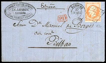 France, 1853, Napoleon III imperforate, 40c orange on yellowish. With four margins tied to folded letter from Bayonne to Bilboa, Spain with scarce losange grid cancel of Bayonne and "Bayonne, 27 Mar, 60" cds, red boxed "PD" handstamp alongside, merchant's advertising corner card handstamp at left, Bilboa receiving backstamp, Extremely Fine, with 2014 Roumet certificate. Yvert No. 16. Scott No. 18; Estimate $200 - 300. US$200-300 (Image)