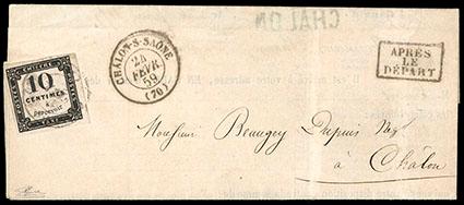 France, Postage Due, 1859, 10c black, litho. Four margins, tied to unfranked 1859 local cover (printed railway form) with "Chalon-S-Saõne 24, Fe, 59" circular datestamp, a second strike alongside, boxed "Après Le Dêpart" (missed local delivery) marking at right, Very Fine, signed Goebel. Yvert No. 1. Scott No. J1; Estimate $150 - 200. US$150-200 (Image)