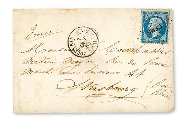 1863, French Expeditionary Forces, Bureau H, cover to Strasbourg franked with a France 1862, 20c blue, tied by clear "CEM H" dotted lozenge with an equally clear "Corps Exp. Mexique/ Bau.H, 3 Oct 63" c.d.s., endorsed "Yarlahuaca" on the back and backstamped Paris (Nov 8) & Strasbourg (Nov 10), Fine to Very Fine. (Image)