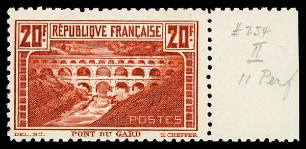 1930, Pont du Gard, 20fr bright red brown, perf. 11 (Scott 254), right margin single, o.g., never hinged, fresh, bright positional with strong, rich color, Fine to Very Fine. Yvert 262B. Scott $1,650. (Image)