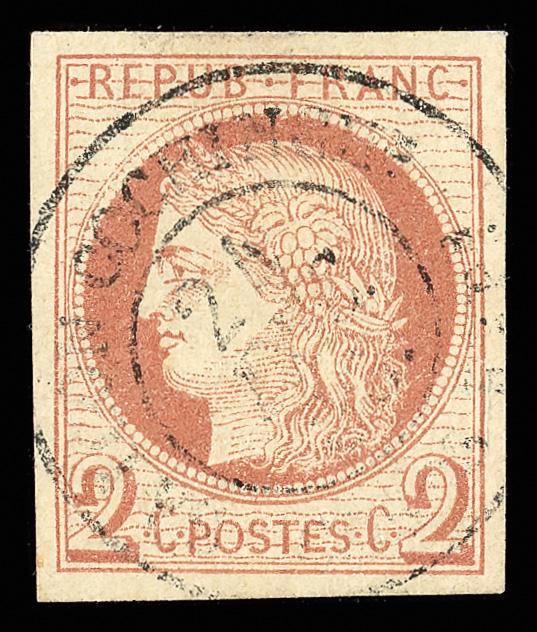 1876, 2c red brown (Scott 17), mathematically centered four-margined example with socked-on-the-nose Cochin-Chine double-ring postmark; small thin/repair in nose, otherwise Extremely Fine, signed faintly. Yvert 15. Maury 15. Scott $750. (Image)