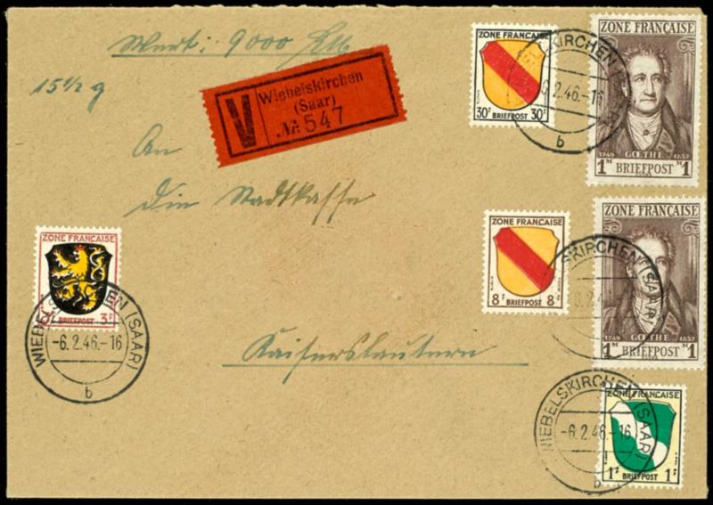 1 Mark Goethe, two pieces in properly franked mixed franking with 1, 3, 8 and 30 pfennigs coat of arms on insured letter over 9.000 Mark from WIEBELSKIRCHEN (Saar) 6.2.46 to Kaiserslautern, superb (11(2),1,2,4) 1 Mark Goethe, zwei Stück in portogerechter MiF mit 1, 3, 8 und 30 Pfennig Wappen auf Wertbrief über 9.000 Mark ab WIEBELSKIRCHEN (SAAR) 6.2.46 nach Kaiserslautern, Pracht (Image)