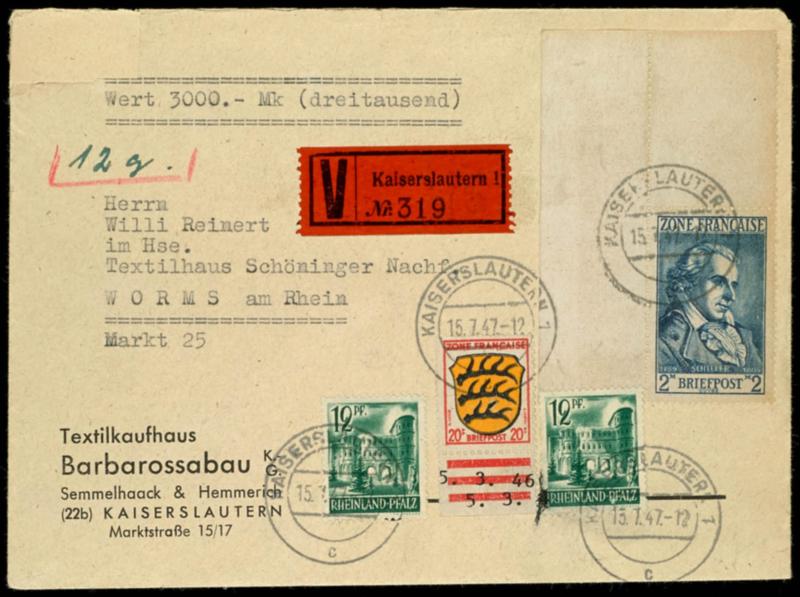 2 Mark Schiller with corner margin top left, 20 pfennigs coat of arms and 2 x Rhineland Palatinate 12 pfennigs, partly minimal traces, on properly franked insured letter over 3.000 RM from KAISERSLAUTERN 15.7.47 to Worms, arrival 16.7.47 (12,10) 2 Mark Schiller mit Eckrand oben links, 20 Pfennig Wappen und 2 x Rheinland Pfalz 12 Pfennig, teils minimale Spuren, auf portogerechtem Wertbrief über 3.000 RM ab KAISERSLAUTERN 15.7.47 nach Worms, Ankunft 16.7.47 (Image)