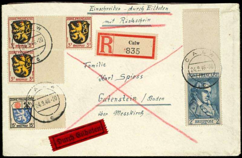 2 Mark Schiller with upper margin and blank field in full stamp size, 3 pfennigs coat of arms in the gutter pair as well 3 and 15 pfennigs on properly franked special delivery R advice of delivery letter CALW 24.9.46 to Gutenstein, arrival 27.9.46, superb (12,2ZW,7) 2 Mark Schiller mit Oberrand und Leerfeld in voller Markengröße, 3 Pfennig Wappen im Zwischenstegpaar sowie 3 und 15 Pfennig auf portogerechtem Eilboten-R-Rückschein-Brief CALW 24.9.46 nach Gutenstein, Ankunft 27.9.46, Pracht (Image)