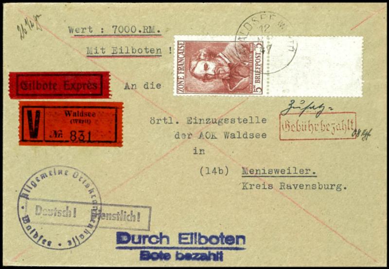 5 Mark Heine with at the bottom attached blank field in stamp size in part-cash-postage with boxed handstamp of one line \taxe precu\ and entry 8 Pfg on special delivery insured letter over 7.000 Mark from WALDSEE12.5.47 to Menisweiler, arrival Aulendorf 12.5.47 and rural postal service box cancel of 2 lines, superb (13) 5 Mark Heine mit unten anhängendem Leerfeld in Markengröße in Teil-Barfrankatur mit Ra1 \Gebühr bezahlt\ und Eintrag 8 Pfg auf Eilboten-Wertbrief über 7.000 Mark ab WALDSEE12.5.47 nach Menisweiler, Ankunft Aulendorf 12.5.47 und Landpost-Ra2, Pracht (Image)